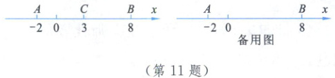 11. 数轴是初中数学的一个重要工具,利用数轴可以将数与形完美地结合,研究数轴可以发现:若数轴上点 $ A $、点 $ B $ 表示的数分别为 $ a $、$ b $,则 $ A $,$ B $ 两点之间的距离 $ AB = |a - b| $,线段 $ AB $ 的中点表示的数为 $ \frac{a + b}{2} $.如图,数轴上点 $ A $ 表示的数为 $ -2 $,点 $ B $ 表示的数为 $ 8 $,则 $ A $,$ B $ 两点间的距离 $ AB = | - 2 - 8| = 10 $,线段 $ AB $ 的中点 $ C $ 表示的数为 $ \frac{-2 + 8}{2} = 3 $,点 $ P $ 从点 $ A $ 出发,以每秒 $ 3 $ 个单位长度的速度沿数轴向右匀速运动,同时点 $ Q $ 从点 $ B $ 出发,以每秒 $ 2 $ 个单位长度的速度沿数轴向左匀速运动.设运动时间为 $ t $ 秒 $ (t > 0) $.