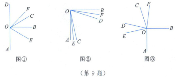 9. 已知$\angle AOB = 90^{\circ}$,$\angle COD = 60^{\circ}$,$OE$ 平分$\angle AOC$,$OF$ 平分$\angle BOD$。