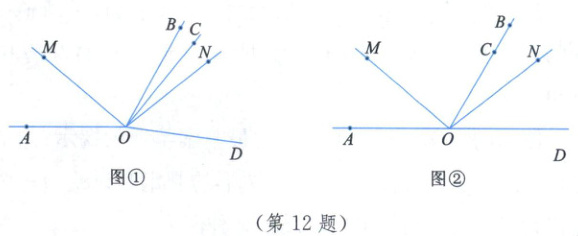12. 如图①,已知$\angle AOB = 120^{\circ}$,$\angle COD = 60^{\circ}$,$OM$ 在$\angle AOC$ 内,$ON$ 在$\angle BOD$ 内,$\angle AOM = \frac{1}{3}\angle AOC$,$\angle BON = \frac{1}{3}\angle BOD$。