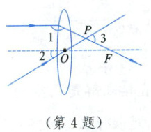 4. 如图,一束平行于主光轴的光线经凸透镜折射后,其折射光线与一束经过光心 O 的光线相交于点 P,点 F 为焦点。若∠1 = 155°,∠2 = 30°,则∠3 的度数为(