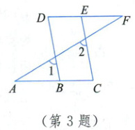 3. 如图,有三个条件:①∠1 = ∠2,②∠C = ∠D,③∠A = ∠F。从中选出两个作为已知条件,另一个作为结论所组成的命题中,真命题的个数为(