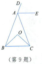9. 如图,已知 AE 平分∠CAD,AE//BC,O 为△ABC 内一点。∠OBC = ∠OCB,求证:∠ABO = ∠ACO。
