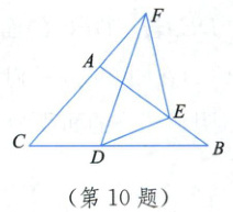 10. 如图,$D$ 是 $\triangle ABC$ 边 $BC$ 上一点,且 $CD:DB = 2:3$,$E$ 是 $AB$ 上一点,且 $AE:EB = 2:1$,$F$ 是 $CA$ 的延长线上一点,且 $CA:AF = 4:3$,若 $\triangle DFE$ 的面积为 $1209$,求 $\triangle ABC$ 的面积.