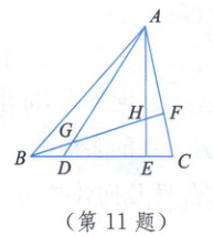 11. 如图,在 $\triangle ABC$ 中,点 $D$,$E$ 在 $BC$ 上,且 $BD = EC=\frac{1}{5}BC$,点 $F$ 在 $AC$ 上,且 $AF=\frac{2}{3}AC$,$BF$ 与 $AD$,$AE$ 分别交于点 $G$,$H$,若 $\triangle ABC$ 的面积为 $1155$,求: