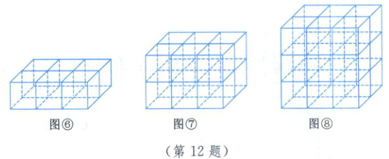 如图⑧,当 $m = 3,n = 2,s = 3$ 时,横放与纵放木棒之和为 $[3×(2 + 1) + (3 + 1)×2]×(3 + 1) = 68$ 条,竖放木棒为 $(3 + 1)×(2 + 1)×3 = 36$ 条,共需 104 条.