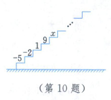 10. 如图,阶梯图的每个台阶上都标着一个数,从下到上的第 1 个至第 4 个台阶上依次标着 $-5$,$-2$,$1$,$9$,且任意相邻的 4 个台阶上标着的数的和都相等.