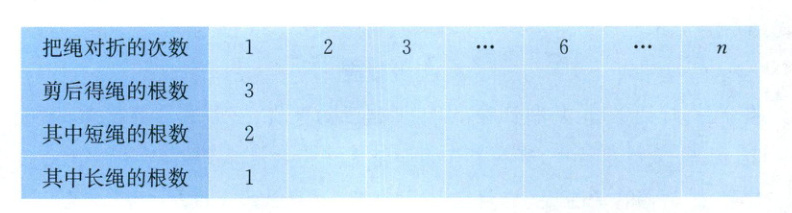 1. 步步为营 把$1$根绳先对折$1$次,然后从当中剪断(如图所示),可得$2$短$1$长的$3$根绳(如下表所记).请将表填写完整.