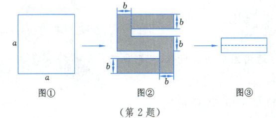 2. 如图①,将一个边长为 $a$ 的正方形纸片剪去两个小矩形,得到一个“ ”的图案,如图②所示,再将剪下的两个小矩形拼成一个新的矩形,如图③所示,则新矩形的周长可表示为