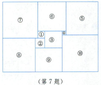 7.③的边长为①②边长之和:$x + y$;⑨的边长为③②边长之和:$y + (x + y) = x + 2y$;⑧的边长为⑨②边长之和:$y + (x + 2y) = x + 3y$;⑦的边长为⑧的边长加上②与①边长之差:$(x + 3y) + (y - x) = 4y$;⑥的边长为⑦的边长减去①边长:$4y - x$;④的边长为⑥的边长减去①与③边长之和:$(4y - x) - (x + x + y) = 3y - 3x$;⑤的边长为⑥④边长之和:$(4y - x) + (3y - 3x) = 7y - 4x$;⑩的边长为⑤④边长之和:$(7y - 4x) + (3y - 3x) = 10y - 7x$.