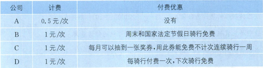 从估计这学期张某用共享单车的相应时间、次数切入.这个学期有 20 周,19 个周末(含三天国家法定节假日:清明、五一,端午),不足半小时的次数有 $(20× 5 - 3)× 4 = 388$ 个,还有 $19× 2 = 38$ 个 50 分钟(回家、返校)的单程.对此,若用 $A$ 公司的车,约需付费:$388× 0.5 + 38× 1 = 232$(元).若用 $B$ 公司的车,约需付费:$388× 1 = 388$(元).若用 $C$ 公司的车,大体认为在 4.5 个月的周期里,可以免单 4.5 周,计费的学习日不超过 $15.5× 5\approx 78$(天),周末加国家法定节假日不超过 15 个,约需付费不超过:$78× 4 + 15× 4 = 372$(元).若用 $D$ 公司的车,约需付费:$\frac{388}{2}× 1 + \frac{38}{2}× 1 = 213$(元).综上所述,选用 $D$ 公司的车最省钱,即最划算. 另外,如此高频地用自行车,建议购置一辆普通自行车,从而进一步降低骑行成本.