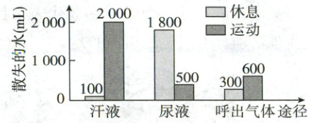 15. 在环境和进食相同的条件下,测定人体在休息和运动两种状态下通过三条途径所散失的水,结果如图所示。下列分析正确的是(