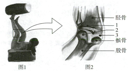 18. 图1是中国传统杂技蹬鼓,图2是杂技演员的膝关节结构图。下列说法错误的是 (