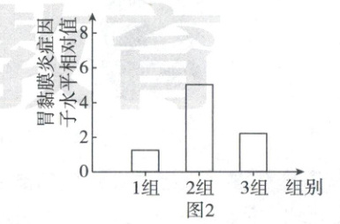 。(2)为探究幽门螺杆菌与胃黏膜炎症的关系以及乳酸菌对幽门螺杆菌的影响,研究人员用30只小鼠平均分成3组进行实验,如表所示(“×”表示没有进行相应处理,“√”表示进行相应处理),一段时间后,检测三组小鼠胃黏膜炎症因子水平相对值(炎症因子水平相对值越高,炎症越严重),并计算每组的平均值,结果如图2所示。