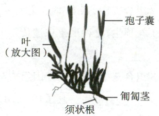 苔藓植物:“茎”弱小、无输导组织,有假根、起固定作用、不吸收水和无机盐,孢子生殖。