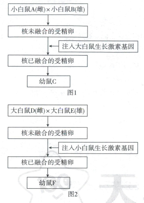 (3)图1中小白鼠的后代幼鼠C体内原本存在小白鼠生长激素基因,后来注入了大白鼠生长激素基因,两种基因同时存在,幼鼠C发育成大白鼠。幼鼠F体内也同时含有两种基因,且幼鼠F本身就为大白鼠后代,因此最可能发育成体型大的白鼠。