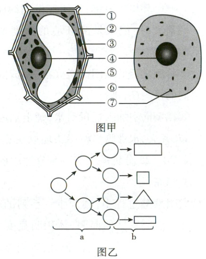 人体通过题图乙中的a细胞分裂、b细胞分化过程后,会形成具有保护功能的上皮组织,保护组织属于植物体的组织 ✖