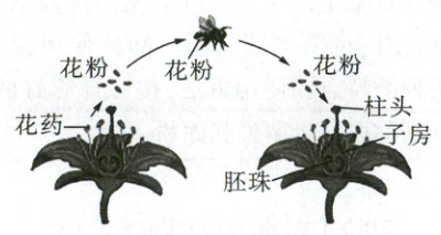 4 B A(✖)题图表示蜜蜂在采蜜时把一朵桃花的花粉传给另一朵桃花,这种传粉类型是异花传粉。