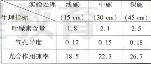 12. 为研究施肥深度对干旱条件下小麦光合作用的影响,研究人员在相同条件下,选择符合实验标准的三个地块施肥、播种,长出植株后进行检测,实验数据(单位已省略)如下表所示。下列说法错误的是(