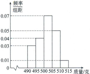 (1)质量超过505克的产品的频率为$5×0.05+5×0.01=0.3$,