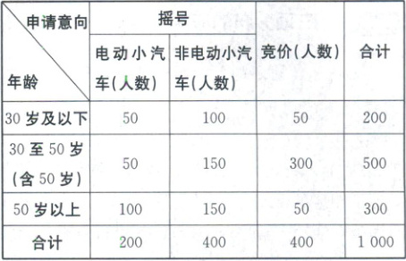 (1)因为30至50岁(含50岁)的人中有意向参与摇号申请电动小汽车、非电动小汽车和竞价申请的人数占总体的比例分别为$\frac{50}{500}=\frac{1}{10},\frac{150}{500}=\frac{3}{10}$和$\frac{300}{500}=\frac{3}{5}$,所以抽取的10人中摇号申请电动小汽车、非电动小汽车和竞价申请的人数分别为$\frac{1}{10}×10=1(人),\frac{3}{10}×10=3(人)$和$\frac{3}{5}×10=6(人)$.