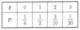 $P(\xi=2)=\frac{C_6^2C_4^2}{C_{10}^4}=\frac{3}{10}$,$P(\xi=3)=\frac{C_6^1C_4^3}{C_{10}^4}=\frac{1}{30}$,