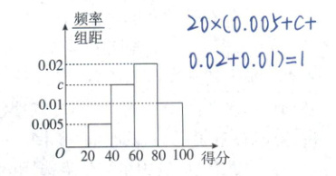 $\therefore20×(0.005 + 0.01 + c + 0.02)=1$,解得$c = 0.015$.