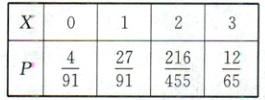 $\frac{12}{65}$ 则$E(X)=0×\frac{4}{91}+1×\frac{27}{91}+2×\frac{216}{455}+3×\frac{12}{65}=\frac{9}{5}$.