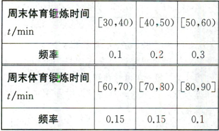 (1)估计这$600$名学生周末体育锻炼时间的平均数$\overline{t}$;(同一组中的数据用该组区间的中点值作代表)