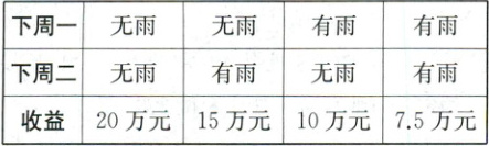 已知下周一和下周二有雨的概率相同,两天是否下雨互不影响,基地收益为$20$万元的概率为$0.36$.