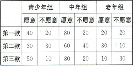 15. (2025·上海宝山模拟)某甜品店打算推出三款新品,在前期市场调研时,将顾客按照年龄分为青少年组、中年组和老年组,随机调查了$200$名顾客对这三款新品的购买意愿,统计数据如下(单位:人):