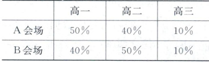 (2)依题意,$n × 0.75 × 0.5 = 75$,解得$n = 200$,故抽到的 A 会场的学生总数为 50 人,其中高一年级人数为$50 × 50\% = 25$,高二年级人数为$50 × 40\% = 20$,高三年级人数为$50 × 10\% = 5$.