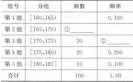 (1)第1组的频数为100×0.1 = 10,所以①填100 - 10 - 20 - 20 - 10 = 40,对应频率0.4.②填$\frac{20}{100}=0.2$,由此补全频率分布表如下: