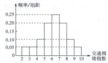 14. 交通拥堵指数是综合反映道路网畅通或拥堵的指标,记交通拥堵指数为T,其范围为$[0,10]$,分别有五个级别:$T\in[0,2)$,畅通;$T\in[2,4)$,基本畅通;$T\in[4,6)$,轻度拥堵;$T\in[6,8)$,中度拥堵;$T\in[8,10]$,严重拥堵.晚高峰时段$(T\geq2)$,某市交通指挥中心选取了市区20个交通路段,依据各路段的交通拥堵指数数据绘制的频率分布直方图如图所示,用比例分配分层随机抽样的方法从交通指数在$[4,6)$,$[6,8)$,$[8,10]$的路段中共抽取6个路段,则中度拥堵的路段应抽取