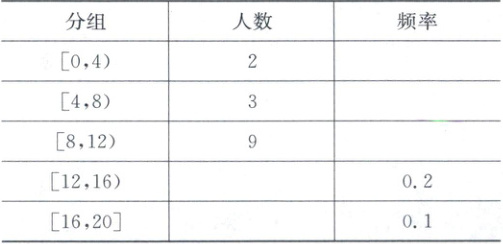 10. 某中学为了了解全校学生的阅读情况,在全校采用随机抽样的方法抽取一个样本进行问卷调查,并将他们在一个月内去图书馆的次数进行了统计,并把结果分为 5 组:[0,4),[4,8),[8,12),[12,16),[16,20],制作了如图所示的频率分布表,则抽样总人数为