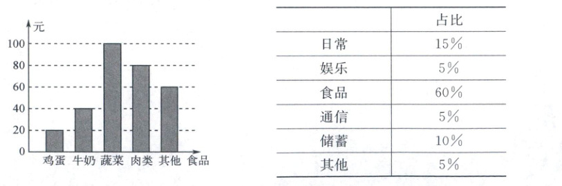 11. 小李同学一周的总开支分布如下表所示,一周的食品开支如下图所示,则小李同学一周的蔬菜开支占总开支的百分比为