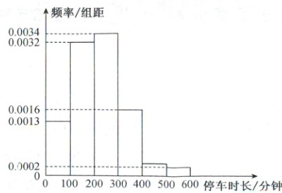 (1)根据频率分布直方图中所有频率和为1,设(400,500]的频率为x,则$(0.0002+0.0013+0.0016+0.0032+0.0034)×100+x=1$,解得$x=0.03$,所以样本中停车时长在区间(400,500]上的频率为0.03.