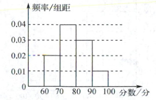 12. 某公司计划招聘一批新员工,现有 100 名应届毕业生应聘,通过考试成绩择优录取,这100 人考试成绩的频率分布直方图如图所示,若该公司计划招聘 60 名新员工,则估计新员工的最低录取成绩为