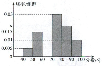 6. C 对于选项A,由图知,0.15<10a<0.3,所以分数在[80,100)内的频率为10a+0.1,且0.25<10a+0.1<0.4,0.55<10a+0.4<0.7,所以中位数在[70,80)内,但不一定大于75,所以A错误;对于选项B,由题意可知,分数在[60,70)内的频率为0.4-10a,所以该地学生成绩的平均数为$\bar{x}=45 × 0.05+55 × 0.15+65 × (0.4-10a)+75 × 0.3+85 × 10a+95 × 0.1=68.5+200a,$由图可知$a \in (0.015,0.03),$所以$\bar{x}=68.5+200a \in (71.5,74.5),$所以B错误;对于选项C,设学生成绩的最低分为n,最高分为m,则$40 \leq n \leq 50,$$90 \leq m \leq 100,$由不等式的基本性质可得$40 \leq m-n \leq 60,$故学生成绩的极差介于40至60之间,所以C正确;对于选项D,由图可知,学生成绩没有超过60分的学生所占比例为(0.015+0.005) × 10=20\%,所以D错误.