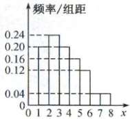 4. C 由频率分布直方图可知众数,即$x_1=\frac{2+3}{2}=2.5,$平均数$x_2=0.2 × 1.5+0.24 × 2.5+0.2 × 3.5+0.16 × 4.5+0.12 × 5.5+0.04 × 6.5+0.04 × 7.5=3.54,$因为[1,3)的频率为(0.2+0.24) × 1=0.44,[3,4)的频率为0.2 × 1=0.2,所以中位数落在区间[3,4)内,则中位数$x_3=3+\frac{0.5-0.44}{0.2} × 1=3.3.$所以$x_1<x_3<x_2.$
