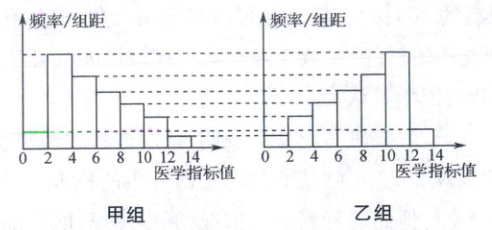 7. 病毒研究所检测甲、乙两组实验小白鼠的某医学指标值,得到样本数据的频率分布直方图如图所示,则下列结论正确的是(