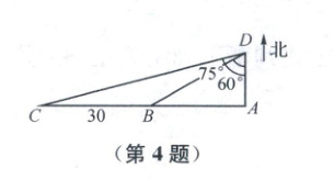 4. A 设船的速度为$a n mile/h$,则由图易知$AB=\sqrt{3}a$,$AC=a·\tan75^{\circ}=(2 + \sqrt{3})a$,$BC = AC - AB = 2a$,又$BC = 30$,所以$a = 15$.