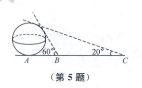 5. 古代数学家刘徽编撰的《重差》是中国最早的一部测量学著作,也为地图学提供了数学基础,根据刘徽的《重差》测量一个球体建筑的高度,已知点 $A$ 是球体建筑物与水平地面的接触点(切点),地面上 $B,C$ 两点与点 $A$ 在同一条直线上,且在点 $A$ 的同侧,若在 $B,C$ 处分别测量球体建筑物的最大仰角为 $60^{\circ}$ 和 $20^{\circ}$,且 $BC = 100\ m$,则该球体建筑物的高度约为(参考数据:$\cos10^{\circ}\approx0.985$)(