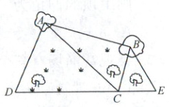 7. 如图,为了测量某湿地 $A,B$ 两点间的距离,观察者找到在同一直线上的三点 $C,D,E$.从点 $D$ 测得 $\angle ADC = 67.5^{\circ}$,从 $C$ 点测得 $\angle ACD = 45^{\circ},\angle BCE = 75^{\circ}$,从 $E$ 点测得 $\angle BEC = 60^{\circ}$. 现测得 $DC = 2\sqrt{3}\ km,CE = \sqrt{2}\ km$,则下列说法符合题意的是(