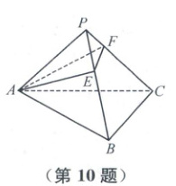 10. 如图,设正三棱锥 $P - ABC$ 的侧棱长为 $l$,$\angle APB = 30°$,$E$,$F$ 分别是 $BP$,$CP$ 上的点,则 $\triangle AEF$ 周长的最小值是