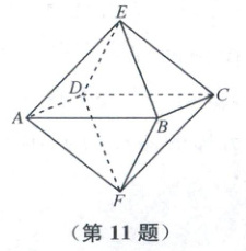 11. 正多面体被古希腊圣哲认为是构成宇宙的基本元素,加上它们的多种变体,一直是科学、艺术、哲学灵感的源泉之一. 如图,该几何体是一个棱长为 2 的正八面体,则此正八面体的体积与表面积之比为