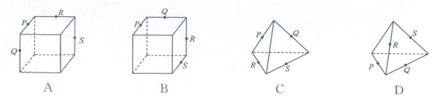 7. 下列正方体或四面体中,$P$,$Q$,$R$,$S$ 分别是所在棱的中点,这四个点共面的图形是(