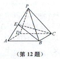 12. 如图,在四棱锥 $ P - ABCD $ 中,底面 $ ABCD $ 为平行四边形,$ E $ 为 $ PA $ 的中点,$ \triangle EBC $ 所在平面截四棱锥得到两个几何体,其中较小的几何体与较大的几何体的体积比为