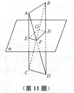 11. 如图所示,已知 $ A,B,C,D $ 四点不共面,且 $ AB // \alpha,CD // \alpha,AC \cap \alpha = E,AD \cap \alpha = F,BD \cap \alpha = H,BC \cap \alpha = G $,则四边形 $ EFHG $ 的形状是