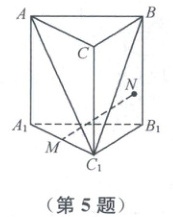 5. 如图,在三棱柱ABC - A₁B₁C₁中,M为A₁C₁的中点,N为侧面BCC₁B₁上的一点,且MN//平面ABC₁.若点N的轨迹长度为2,则 (