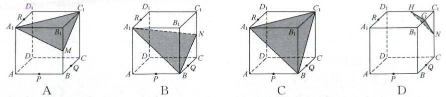 8. 如图,在下列四个正方体中,P,R,Q,M,N,G,H为所在棱的中点,则在这四个正方体中,阴影部分所在平面与P,R,Q三点所在平面不可能平行的是 (